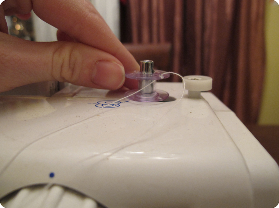 Thread the bobbin {Make sure to get the correct bobbins for your machine- I've had lots of headache using the wrong bobbins on accident.}